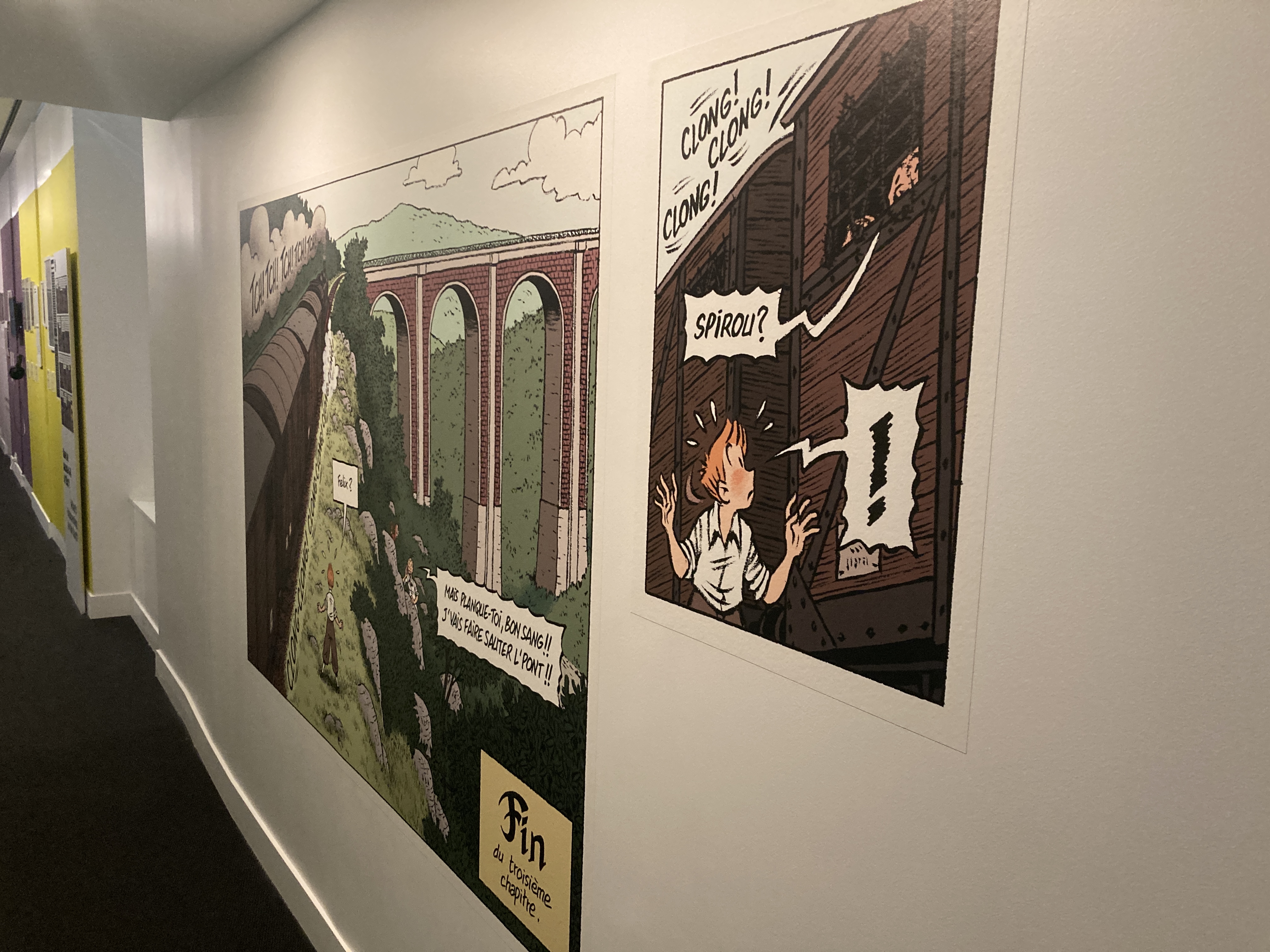 rooms that are connected by two short separate halls. The first room houses seven sections and one centerpiece that anchors visitors first to Emile Bravo and his take on Spirou, then progressively delves into the real-world contexts that inform the narrative.
